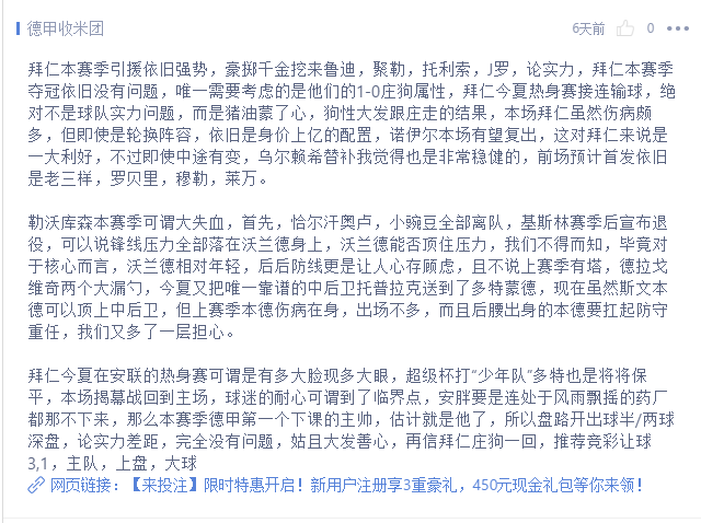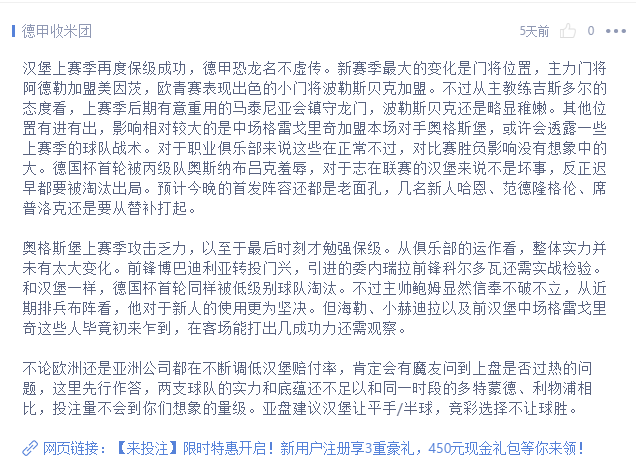 新赛季德甲联赛已经开战。而我们奖堂老**团队【德甲收米团】也强势归来,为魔友带来最纯粹、最地道的德甲分析和推介。上赛季德甲收米团总体表现稳健,也曾创造11连红神迹。新赛季收米团“驾轻就熟”,首轮5红4交出满意答卷。还是熟悉的犀利解析和精准推荐!依旧火爆的讨论氛围和人气!德甲收米团,你的收米首选!