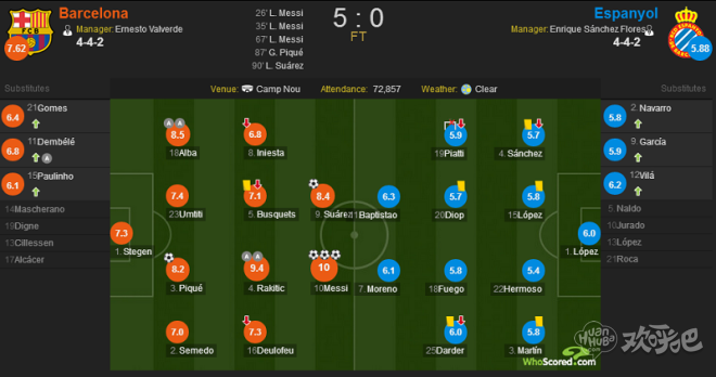 巴塞罗那(4-3-3):1-特尔施特根/2-塞梅多、3-皮克、23-乌姆蒂蒂、18-阿尔巴/5-布斯克茨(73’,15-保利尼奥)、8-伊涅斯塔(78’,21-安德烈-戈麦斯)、4-拉基蒂奇/16-德乌洛费乌(68’,11-小登贝莱)、10-梅西、9-苏亚雷斯