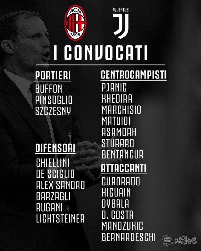 尤文图斯官方公布了客场对阵AC米兰的比赛大名单,曼朱基奇解禁复出,迪巴拉领衔大名单。