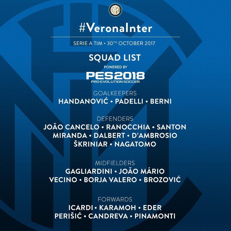 欢呼吧讯,北京时间10月31日3:45,国际米兰将会做客本特戈蒂球场挑战升班马维罗纳。国际米兰公布了他们本轮客场和维罗纳的比赛大名单,因伤缺阵三轮的布罗佐维奇顺利回归。