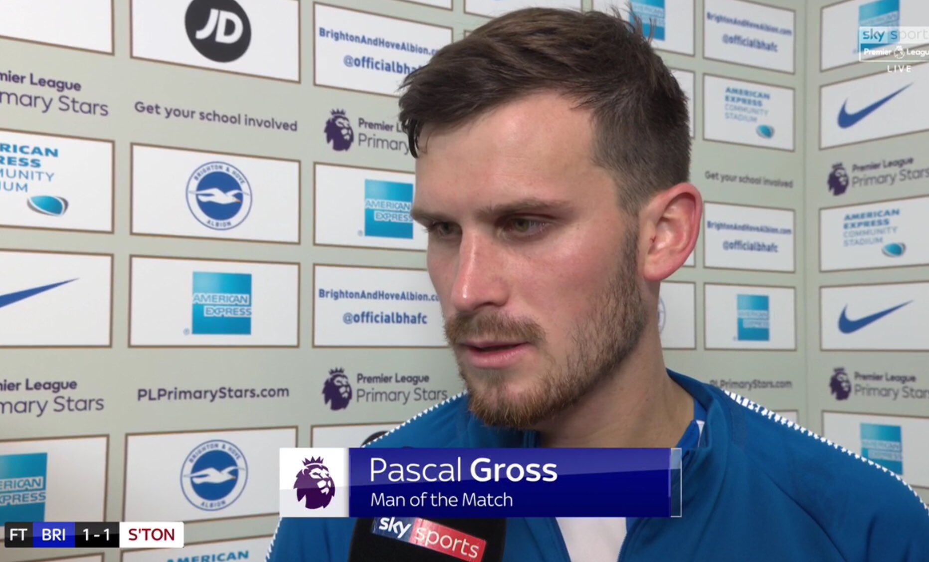 布莱顿1比1战平了南安普顿。而为布莱顿的扳平功臣穆雷送上助攻的中场帕斯卡尔-戈罗斯接受了采访,同时他也获得了天空体育评选的全场最佳球员。