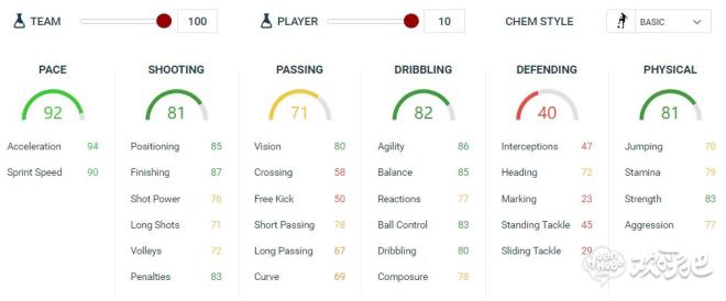 射门方面87的射术完全够用,盘带几项关键数据都在80以上。总体来说该球员没有太大短板。