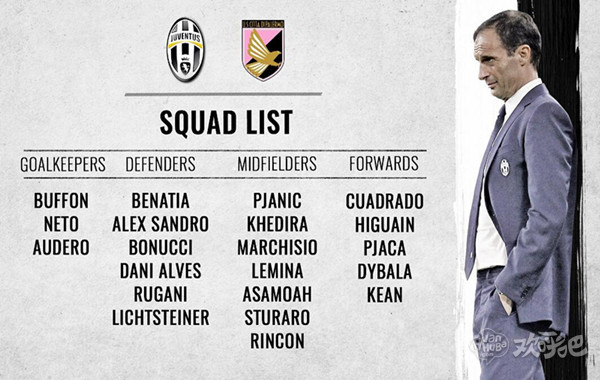 北京时间2月18日凌晨3点45分,尤文将在意甲第25轮主场迎来保级弱旅巴勒莫,赛前尤文官方公布了比赛大名单。