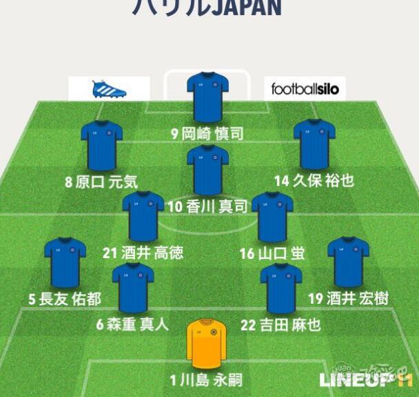 日本首发:川岛永嗣/长友佑都、森重真人、吉田麻也、酒井宏树/酒井高德、山口萤、香川真司/原口元气、久保裕也、冈崎慎司
