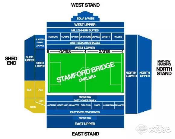 斯坦福桥球场约有42000个座位。看台东西中间一层不卖给普通球迷,通常是捆绑在切尔西的其他娱乐休闲服务,如酒店、温泉等等。切尔西俄罗斯老板阿布的座位在西看台的中上层。