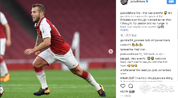 现年25岁的英格兰中场威尔希尔目前代表阿森纳U23出战预备队比赛,虽然球队最终以4:3战胜对手曼城,但他却染红下场。然而威尔希尔在Instagram上写道:这是最重要的一步,重回酋长球场,感觉很不错,虽然比赛结束的比预期要早,但我觉得我的激情与求胜欲重新回来了,我渴望更多的比赛!短短的三言两语却得到了6.8万个赞,不少球迷也留言鼓励!