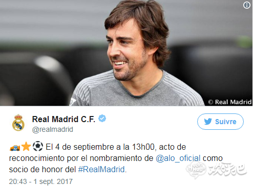 欢呼吧9月5日讯 9月1日,皇马官方推特发布消息,F1世界冠军费尔南多-阿隆索成为俱乐部的荣誉会员。皇马主席弗洛伦蒂诺赠予阿隆索印有其名字的1号球衣。