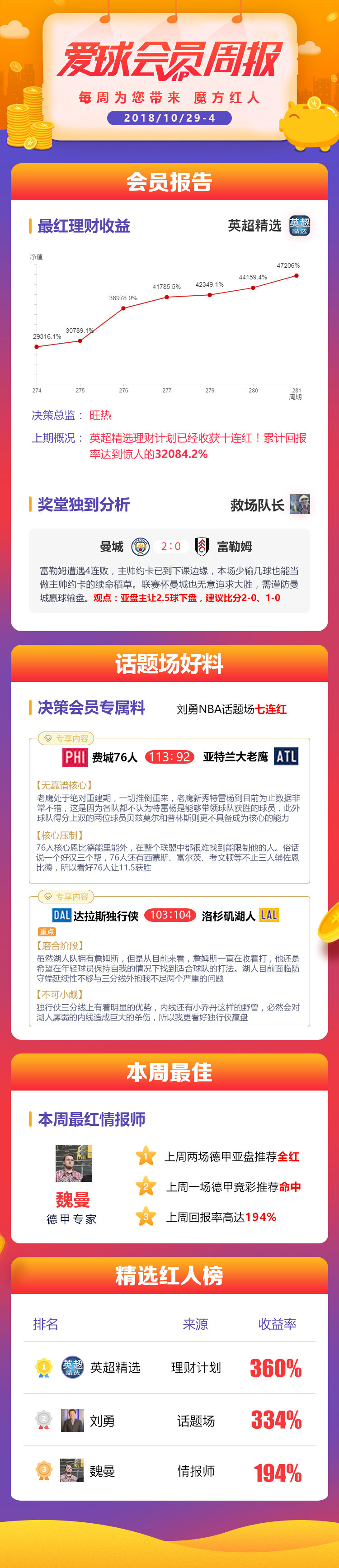 对于广大魔友来说最遗憾的事情莫过于红单没跟上了,为此,足球魔方全新推出“爱球会员周报”,及时总结上周专家战绩,为大家带来上周最红分析师。现在加入魔方会员,关注爱球会员周报!让大家不再错过收米列车,让红单不再迟到!