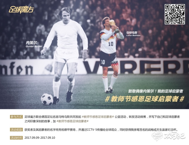9月10日,足球魔方联合德国足坛名宿马特乌斯共同发起一场“教师节 感恩足球启蒙者”的公益活动,诚邀所有爱好足球的魔友参与其中。