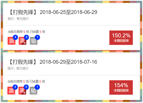 世界杯期间“打假先锋”就与“英超精选”、“小刀精选”一起参与了世界杯理财大PK,最终取得了75%成功过关率的亮眼战绩,其中最后两期更是连续以两个4红1黑的顺利为世界杯收关。