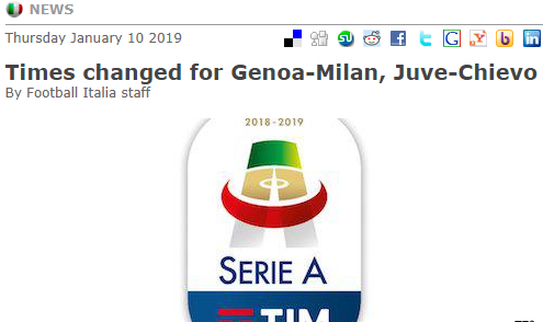 意甲官方宣布第20轮两场比赛时间安排发生变化,一场是米兰客战热那亚的比赛,另外一场则是尤文主场对阵切沃的比赛。据悉,由于热那亚球迷和米兰球迷之间的对立关系,米兰对阵热那亚的比赛被提议在当地时间白天进行。