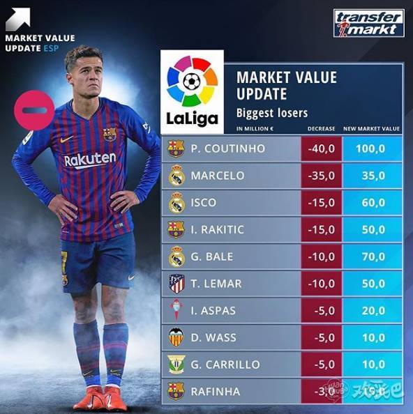 相反的是,库蒂尼奥由于表现不佳,身价从1.4亿下降到了1亿欧元。赛季还没有结束,库鸟还有时间找回最佳状态,并追上登贝莱。此外,皇马的马塞洛身价下降3500万欧元、而维尼修斯身价上涨了3500万欧元。