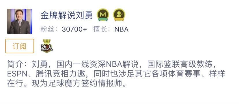 本场比赛我们邀请到了著名解说红人【刘勇老师】来为大家进行分析,他在魔方的NBA推荐一直是当家领军人物,更是有过一周全红的记录,在NBA最后的日子里希望大家不要错过他的精彩推荐!