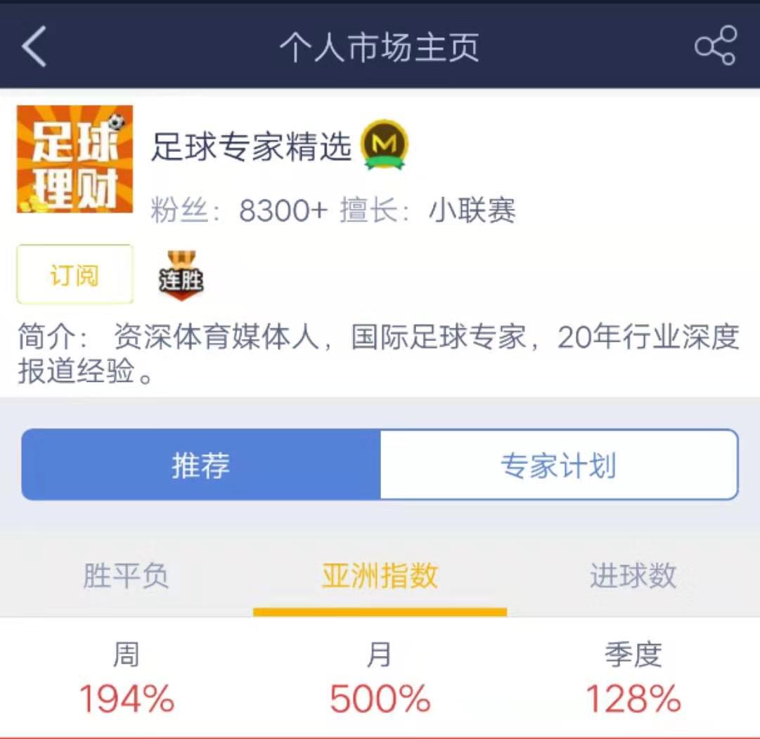 专 家: 足球专家精选推荐理由:资深体育媒体人,20年行业深度报道经验,近日9连红!当前周回报率194%!参与专家计划盈利不断飙升!