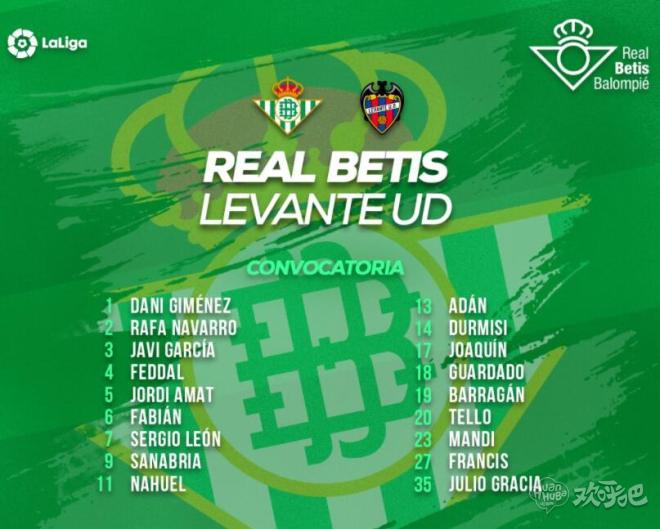 北京时间9月26日凌晨3:00,西甲将进行本轮最后一场角逐。刚刚爆冷击败皇马的贝蒂斯将在主场对垒莱万特,贝蒂斯能否延续良好的势头呢?目前大名单已经公布,来看看吧。