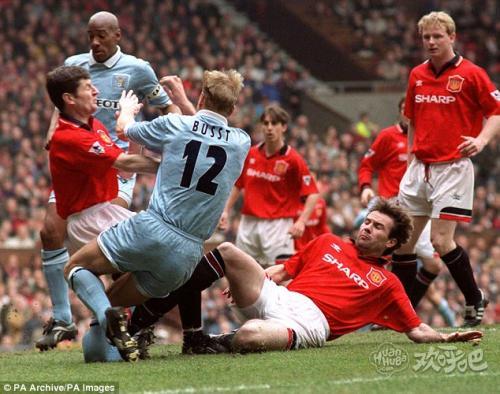 1996年4月8日 曼联VS考文垂,前考文垂队球员大卫-布斯特的球员生涯因一次断腿而终结,1996年代表考文垂队出场的布斯特开场仅2分钟就遭遇两名曼联球员(丹尼尔-欧文和布莱恩-麦克莱尔)铲抢,右腿小腿骨直接骨折,白森森的骨头甚至穿透了皮肤,鲜血淋淋,当时的情景让人不寒而栗。这次受伤也让当时还未满30岁的布斯特彻底告别足球场,而他没遭遇到截肢已经算是足够幸运了。