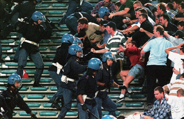 1985年5月29日,英格兰利物浦队与意大利尤文图斯队进行欧冠决赛期间,爆发球迷骚乱。隔离两队球迷的围墙被挤倒,意大利球迷遭到涌过来的英国足球流氓的杀戮,在数百万人的目击下,38名意大利球迷当场死亡。足球流氓们的过激行为激怒了当时的英国首相铁娘子撒切尔夫人,他发表声明颁布条例严打足球流氓,才使得足球流氓的行为略加收敛。而英国所有俱乐部也被国际足联禁止参加欧洲三大杯赛5年。
