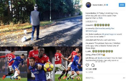 欢呼吧11月8日讯 北京时间昨天,切尔西前锋阿扎尔在社交媒体上发表一张遛狗图片和周末对阵曼联的三张图片,并配文:今天的任务比昨天简单一点 。