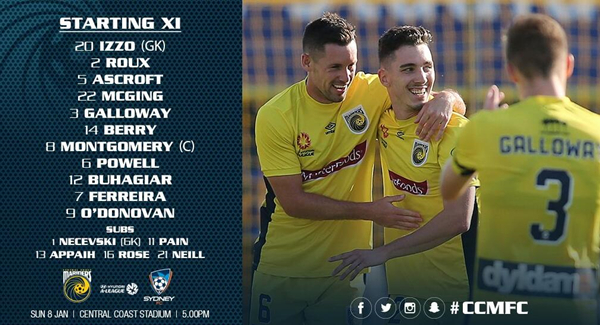 而中央海岸水手方面,法蒂因伤缺席,由小将洛克斯首发,费雷拉替换库比首发登场。