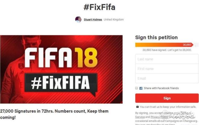最近在Change.org这个公益**网上有玩家发起了对于《FIFA18》游戏中的内购氪金问题发起了反对抵制的**,在短短72小时内这个**项目的参与玩家人数就超过了3万人,并且人数还在急速上升中。显然EA不得不给FIFA玩家们一个交代了。