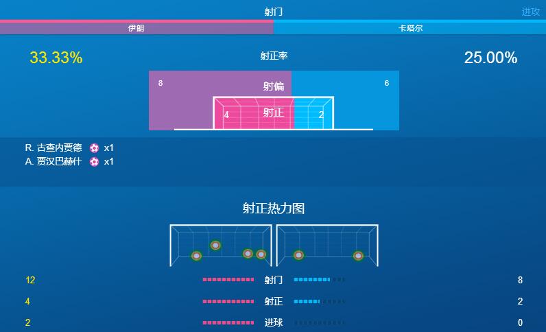 足球魔方同样分析了对阵双方的射门数据。比赛数据分析伊朗的射门率为33.33%高于卡塔尔的25%,射正热力图显示,伊朗在射门、射正、进球上都占有很大的优势。